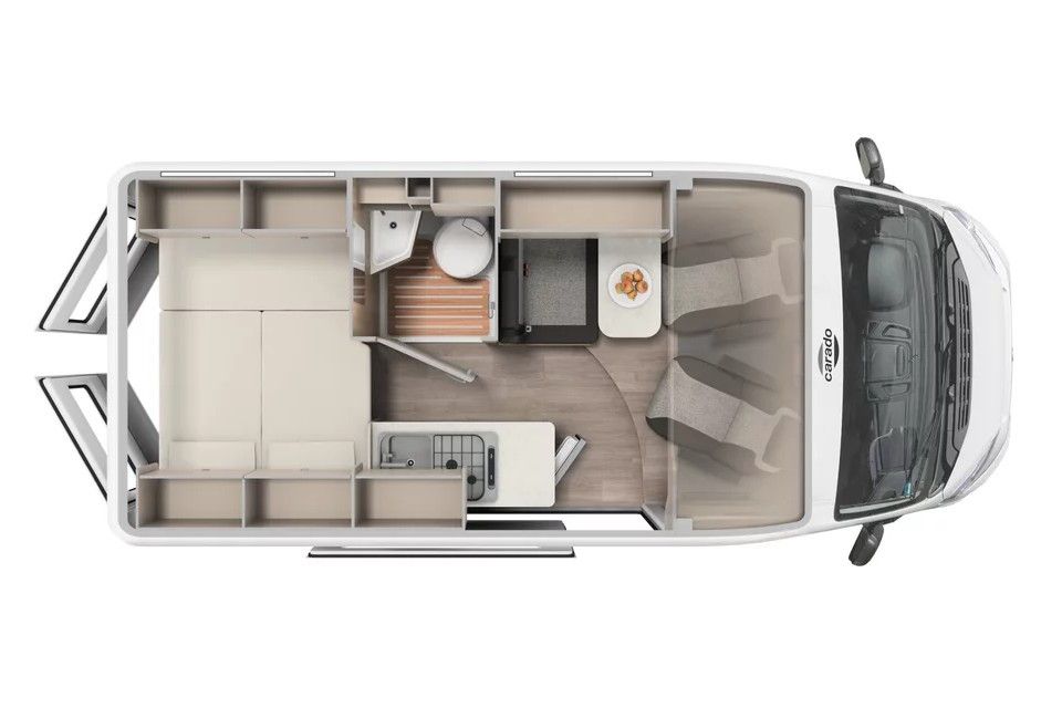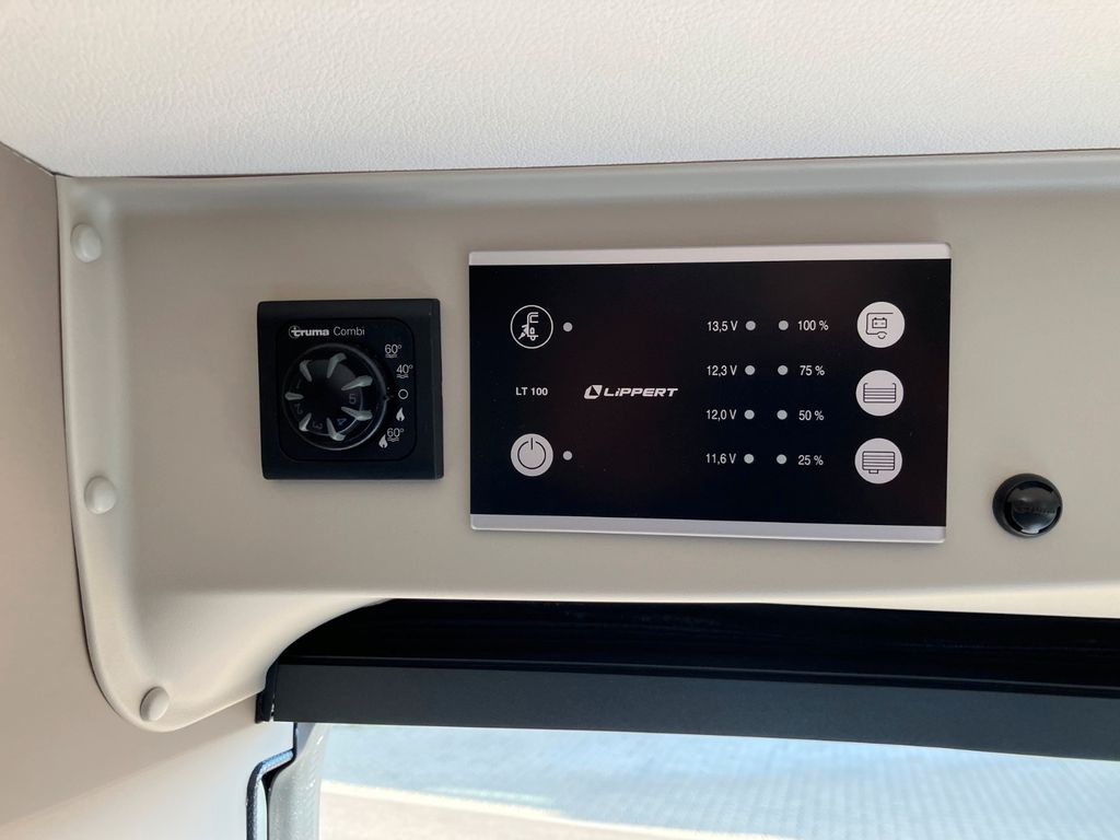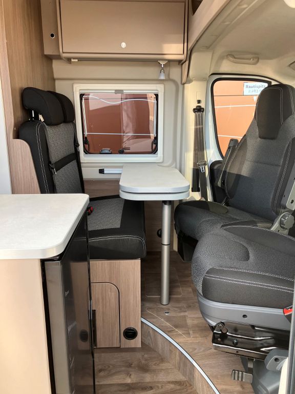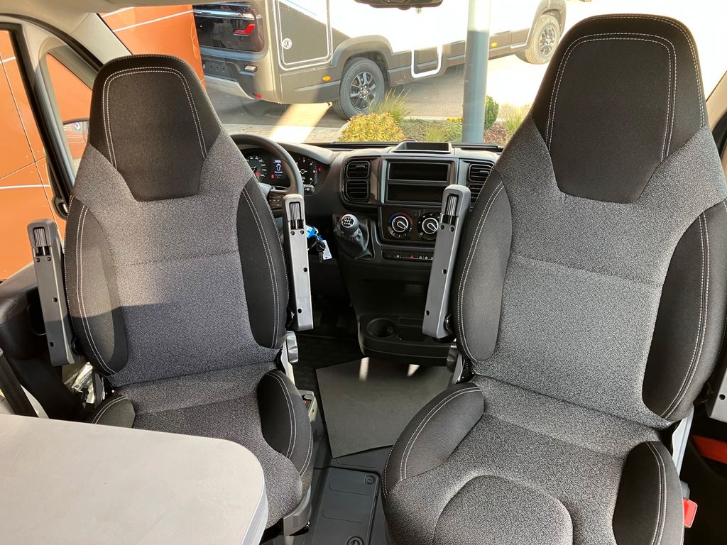 - Basic Paket (Dachhaube Midi Heki 70 x 50 cm über Sitzgruppe, Duschausstattung, Fenster im Bad, Kleiderstange in der Nasszelle, Breite Einstiegsstufe, Drehplatte für Tischerweiterung an der Sitzgruppe)