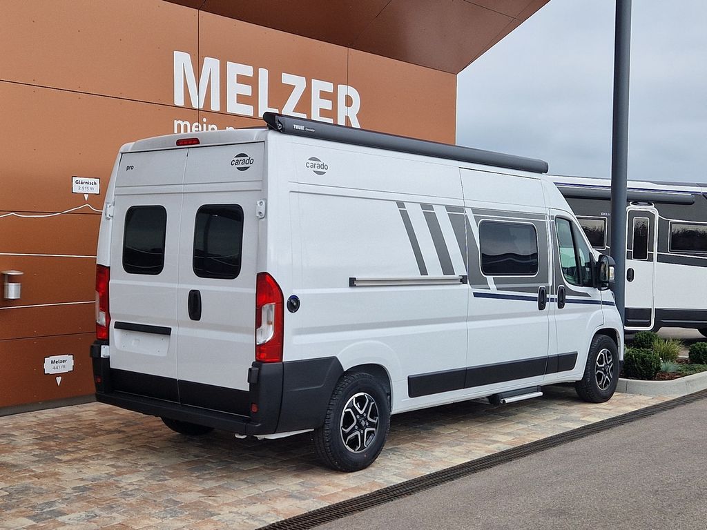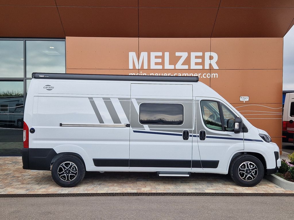 - Carado pro Fiat: Fiat 3,5t 140 PS Manuell Euro 6 E-BIS, Optik Paket 1, Dieseltank 90 l, Chassisfarbe Weiß, Beklebung Carado Alternativ Graues Chassis, Schriftzug pro, Markise 3.75 m schwarz, Faltverdunkelung Fahrerhaus